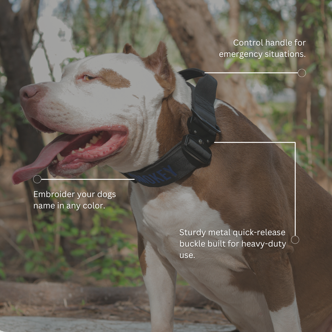 Designed to withstand the strongest of dogs, the collar it self is 2'' wide, made with two layers of military grade nylon, and a layer of neoprene padding for comfort. All of the hardware, including the buckle is made out of metal, and you can't forget about the control handle located at the top of the collar for emergency situations.